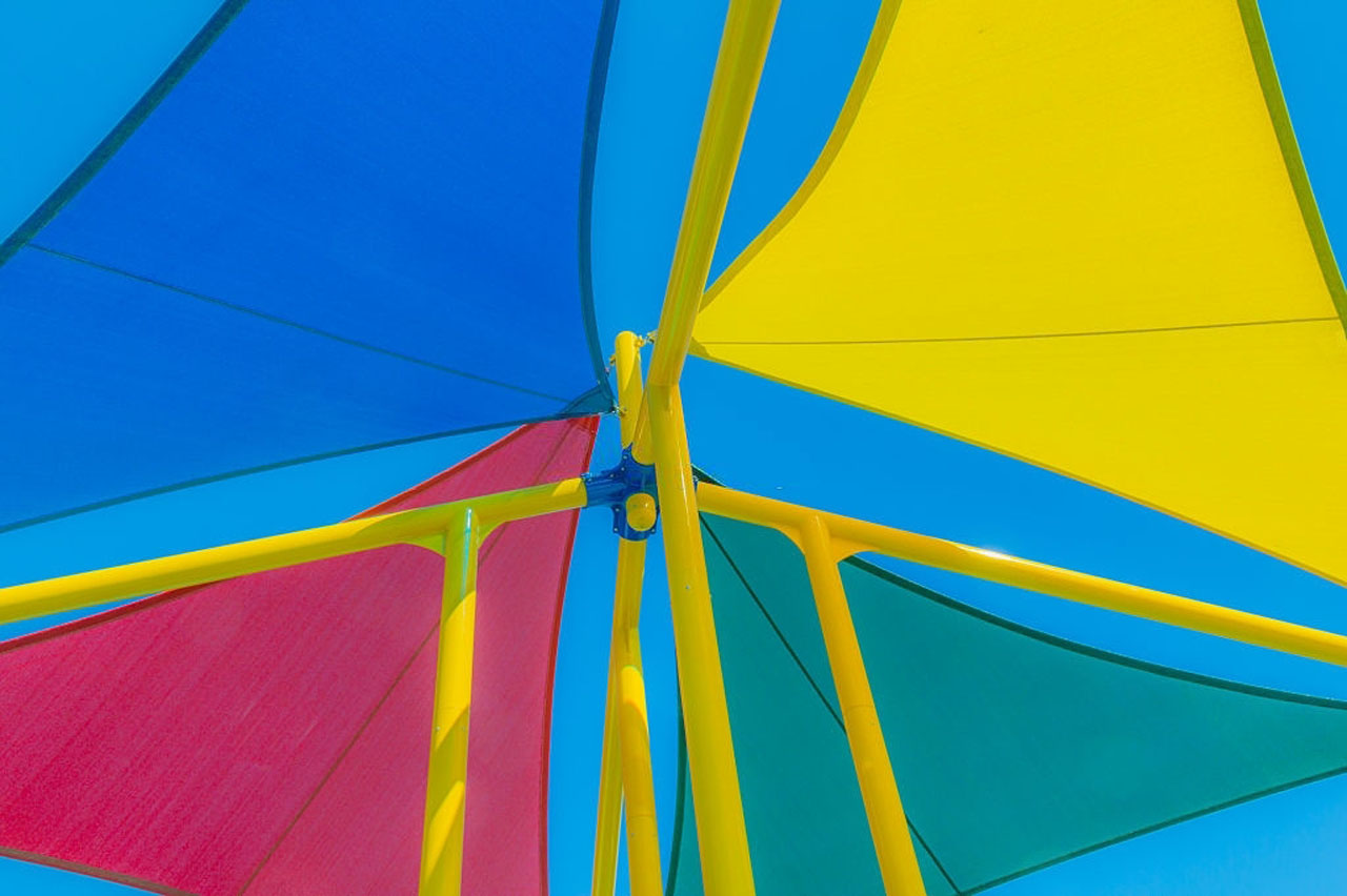 Red, blue, yellow, and green overhead sun shades in Southern California close up against a clear blue sky. The shapes give an abstract feeling to the image. The shades are in triangular shapes. The piping that holds them together is in a bright yellow. This sun shade is in a playground area.